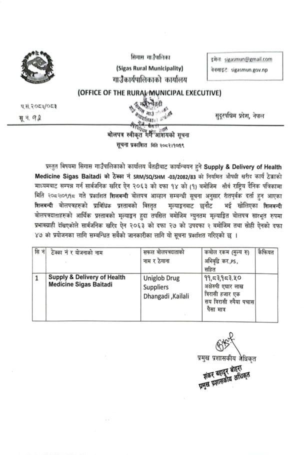 » बोलपत्र स्वीकृत गर्ने आशयको सूचना!