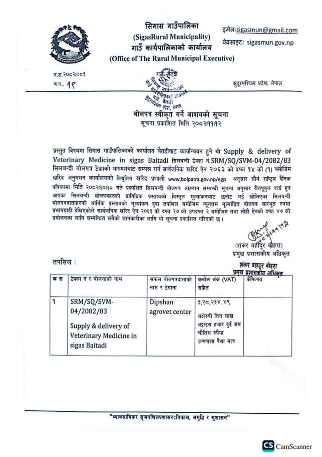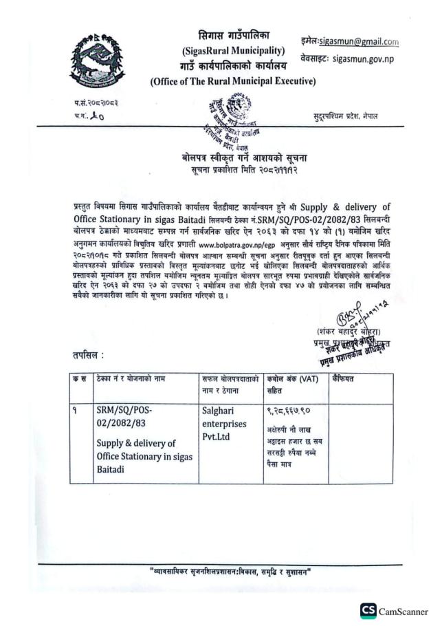 » बोलपत्र स्वीकृत गर्ने आशयको सूचना!