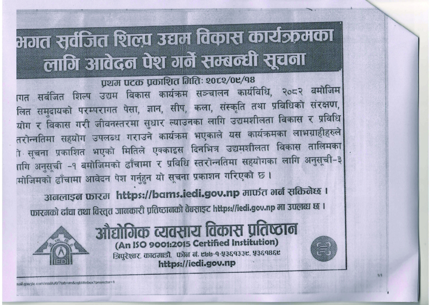 » भगत सर्वजित शिल्प उद्यम विकास कार्यक्रमका लागि आवेदन पेश गर्ने सम्बन्धी सूचना!