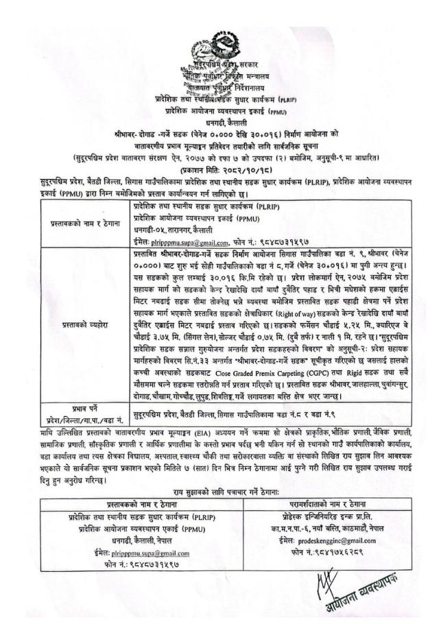 श्रीभावर-दोगाड-गर्जे सडक निर्माण योजनाको वातावरणीय प्रभाव मूल्याङ्कन प्रतिवेदन तयारीको लागि क्षेत्र निर्धारण सम्बन्धी सार्वजनिक सूचना
